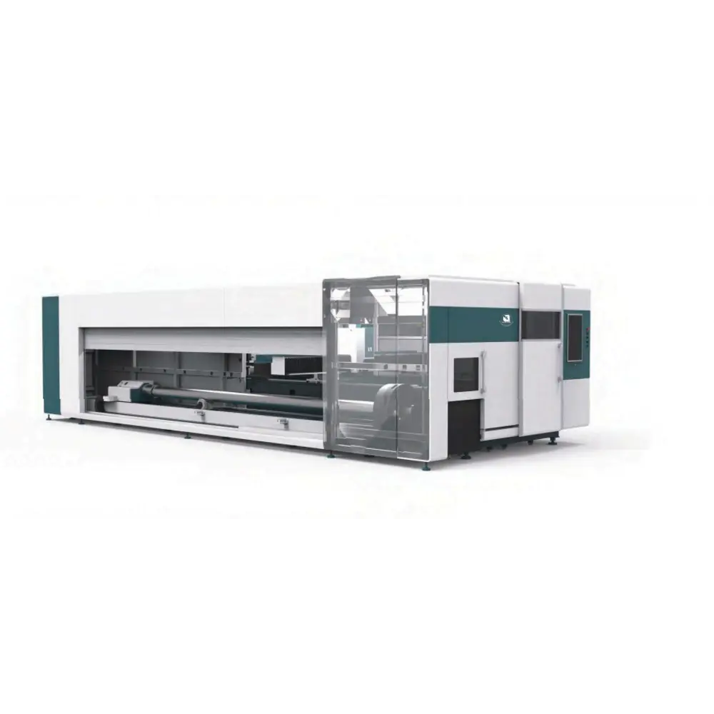 The High Power Cover Exchange Table Rotary Fiber Laser Cutting Machine is designed for advanced metal cutting applications. It combines sheet cutting and tube cutting in one powerful machine. With a fully enclosed protective cover and automatic exchange table system, it ensures higher safety, efficiency and precision. This machine is widely used for cutting stainless steel, carbon steel, aluminum and metal tubes in industrial manufacturing and fabrication industries.